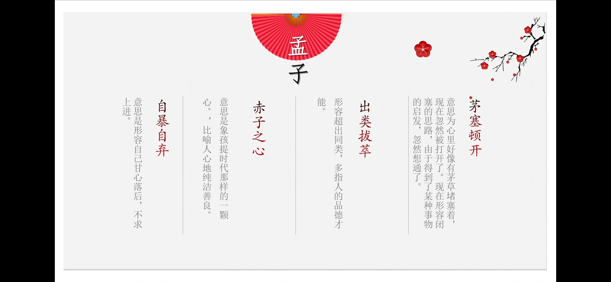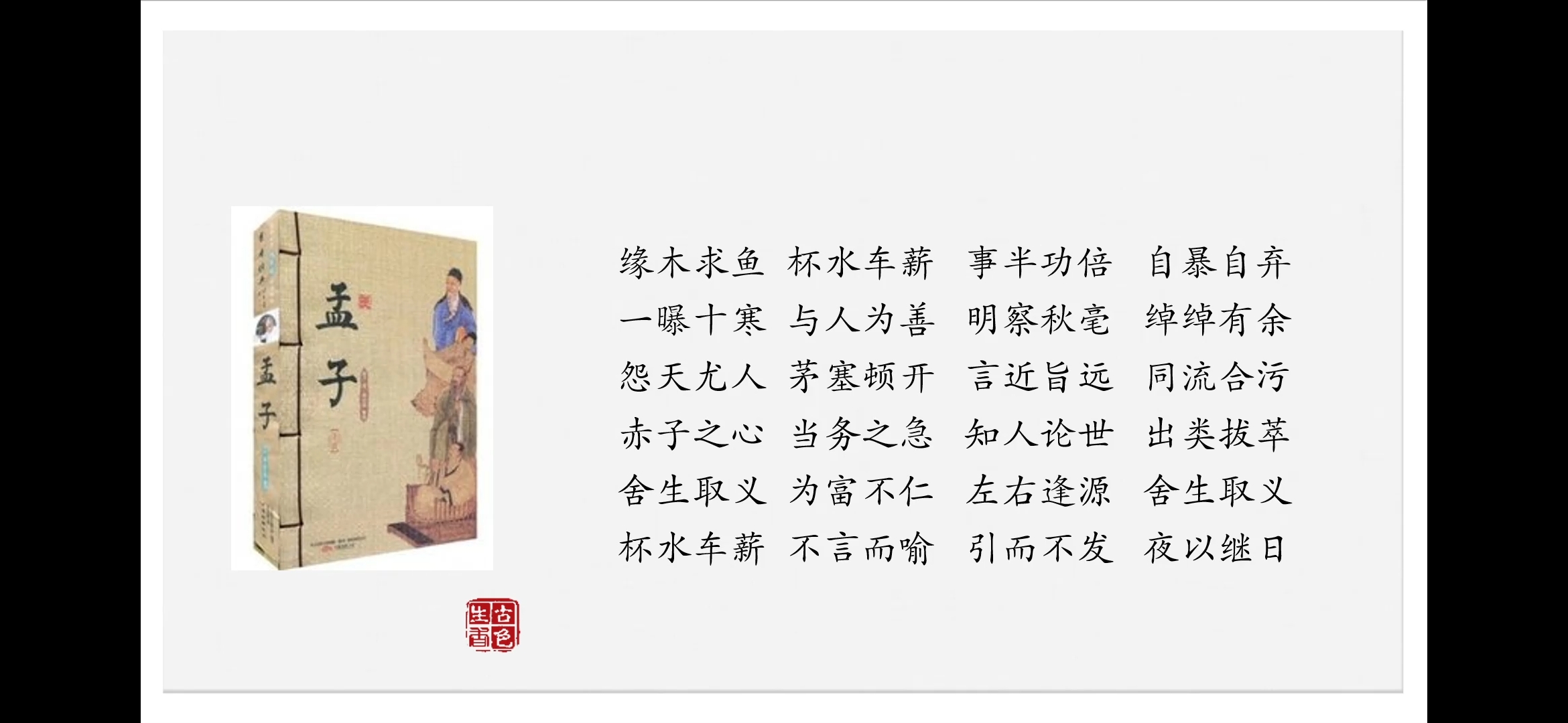 •得道者多助,失道者寡助。 ·天时不如地利,地利不如人和。 ·故天将降大任于是人也,必先苦其心志,劳其筋骨,饿其体肤,空乏 其身,行拂乱其所为,所以动心忍性,曾益其所不能。 生,亦我所欲也;义,亦我所欲也。两者不可得兼,舍生而取义者也。 ·尽信书则不如无书。 •富贵不能淫,贫贱不能移,威武不能屈,此之谓大丈夫。 ·老吾老,以及人之老;幼吾幼,以及人之幼。 •民为贵,社稷次之,君为轻。