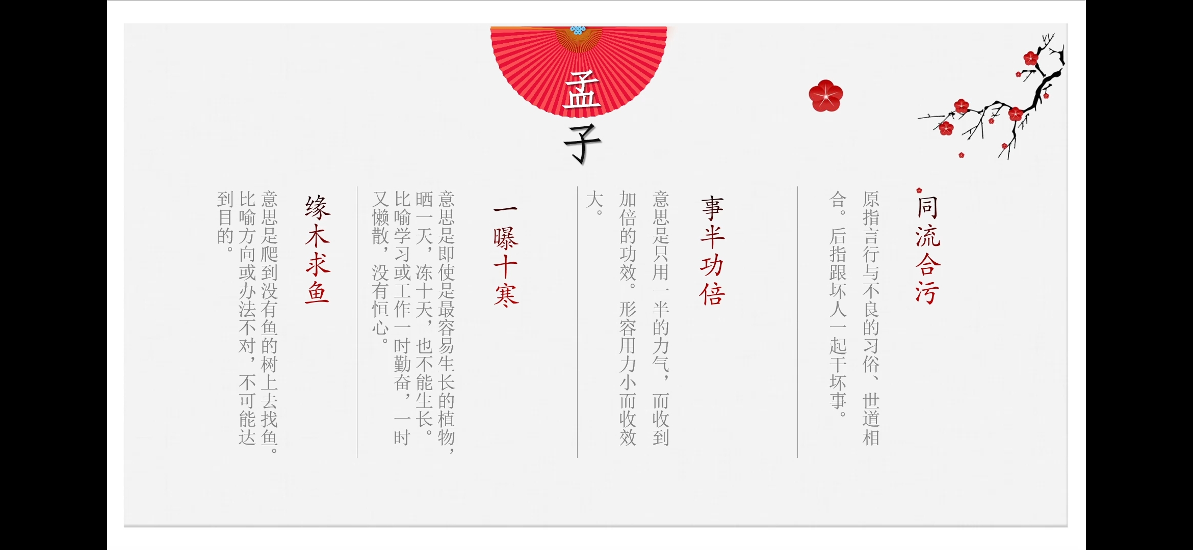 - 成语典故 缘木求鱼 杯水车薪 事半功倍 自暴自弃 一曝十寒 与人为善 明察秋毫 绰绰有余 怨天尤人 茅塞顿开 言近旨远 同流合污赤子之心 当务之急 知人论世出类拔萃舍生取义 为富不仁左右逢源 舍生取义杯水车薪 不言而喻引而不发夜以继日