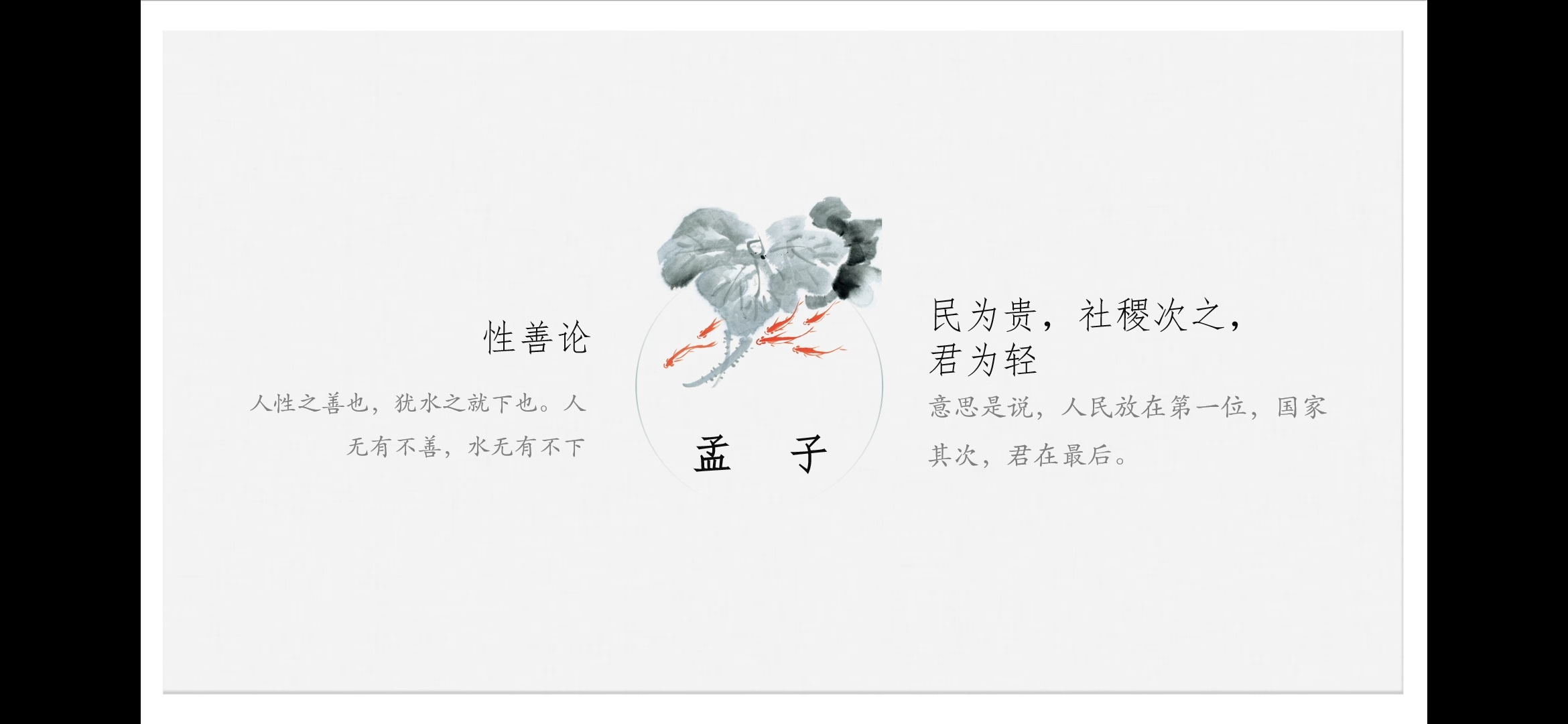 - 理想人格:“富贵不能淫,贫贱不能移,威武不能屈”。认为人格的重要远远高于财富、权力、地位。主张做人要做有“浩然之气”的“大丈夫”。怎样蓄积“浩然之气”,那就是: 一要持志养气,坚持崇高的志向追求; 二要“动心忍性”,有意识地在逆境中磨砺意志; 三要“存心养性”,就是要清心寡欲。孟子的这些主张和理论是对中国传统文化的重要贡献。 浩然之气的“大丈夫”,自古以来激励了无数的志士,诚如冯友兰先生所说:“懂得了这个词汇,才可以懂得中国文化和中华民族的精神。”